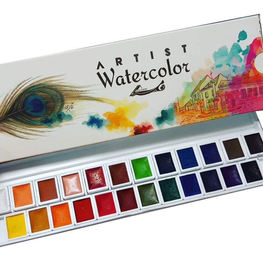 ست آبرنگ آقامیری با کیفیت بالای رنگدانه و انعطاف پذیری بالا. قابلیت ترکیب کردن رنگ ها. دارای رنگ های درخشان و شفاف.